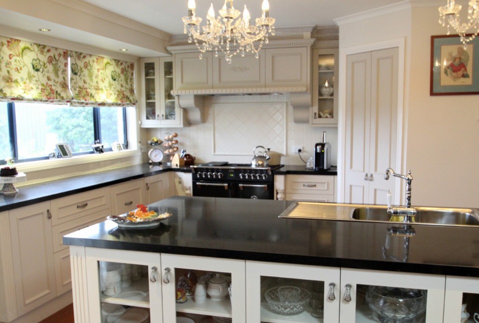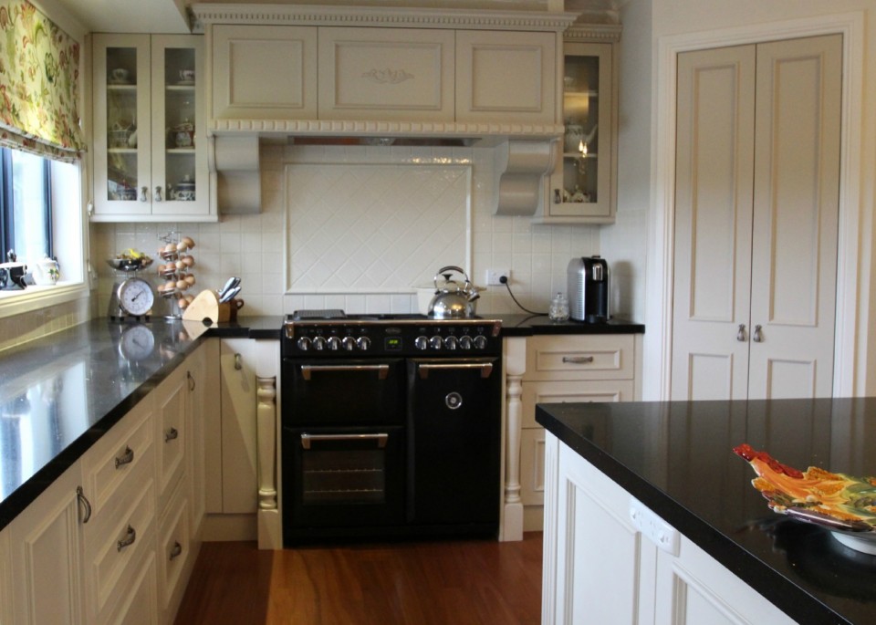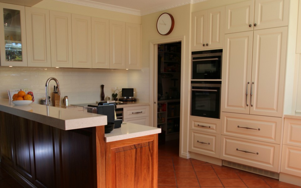 The range hood was custom designed and made by Matthews Joinery and Kitchen Centre. The corbels were made to our client’s specifications. We are happy to work with our client’s to achieve any custom look they are after, we don’t just offer off the shelf elements. The doors for this kitchen were custom made at our factory and 2 pac painted by the 2 Pac Shack in Dulux Natural White Satin PN1E1.