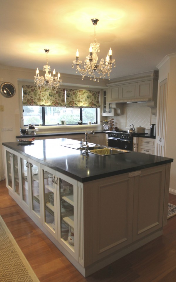 The Designer had wonderful ideas and understood exactly what we wanted. Some of the features we love include; custom capping which connects all cupboards and which is fitted with led strip lights, (with remote control). These lights run across the entire wall of sink and bench area and they provide fantastic light. We love that some of the kitchen doors are glazed doors, which act to feature some of our favourite crockery. We are also delighted with the appliance cupboard which we use as a breakfast and mini snack bar, sort of like a mini pantry with appliances, cups, plates and cutlery. It is another work area in the kitchen and it’s wonderful because several people can be in the kitchen working at the same time, but everyone can have a separate work station. We find the large drawers are so much better than the cupboards we use to have. We seem to be able to fit more in the drawers than the old cupboards. The cupboards and doors are very easy to open and close as they are fitted with soft close hinges. Some of the high cupboards open with a light touch, they are fitted with aventos servo drive lift up doors. These high cupboards have allowed us so much more storage.