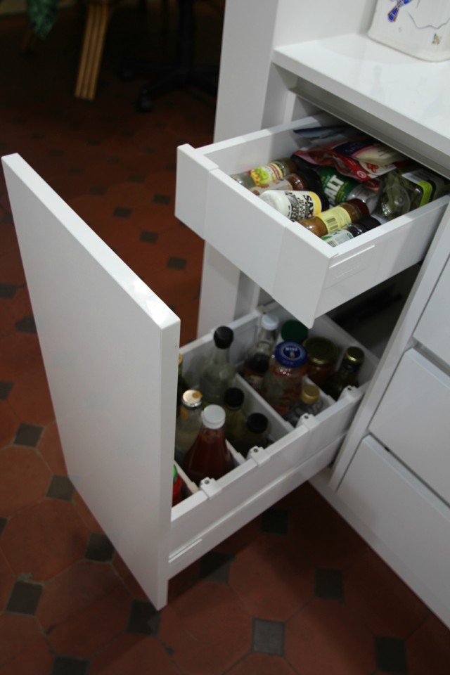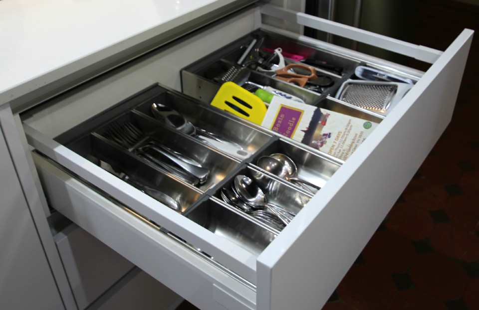 A huge appliance cabinet houses a coffee machine, kettle and toaster. The drawers below allow food items to be stored and easily accessed. The corner cabinets make use of the wire corner units. These units really are one of the most useful and versatile bits of hardware. We have one on display in our Ballarat showroom. Even small 300 mm wide cabinets can provide great storage by using dividers, the Blum Bottle set and inner drawers as shown above. Drawers can be divided up with cutlery and utensil inserts so everything has a place and can be kept neatly and found when needed.