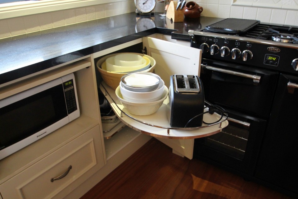 As you can see there are many ways to improve on the accessibility of a corner in your new kitchen. When you discuss your project with your joiner you can look at ways of incorporating the systems that appeal to you. They vary in cost, so budget may also be a factor. Have a good think about what you would like to store in the cabinet as this may also influence your decision.