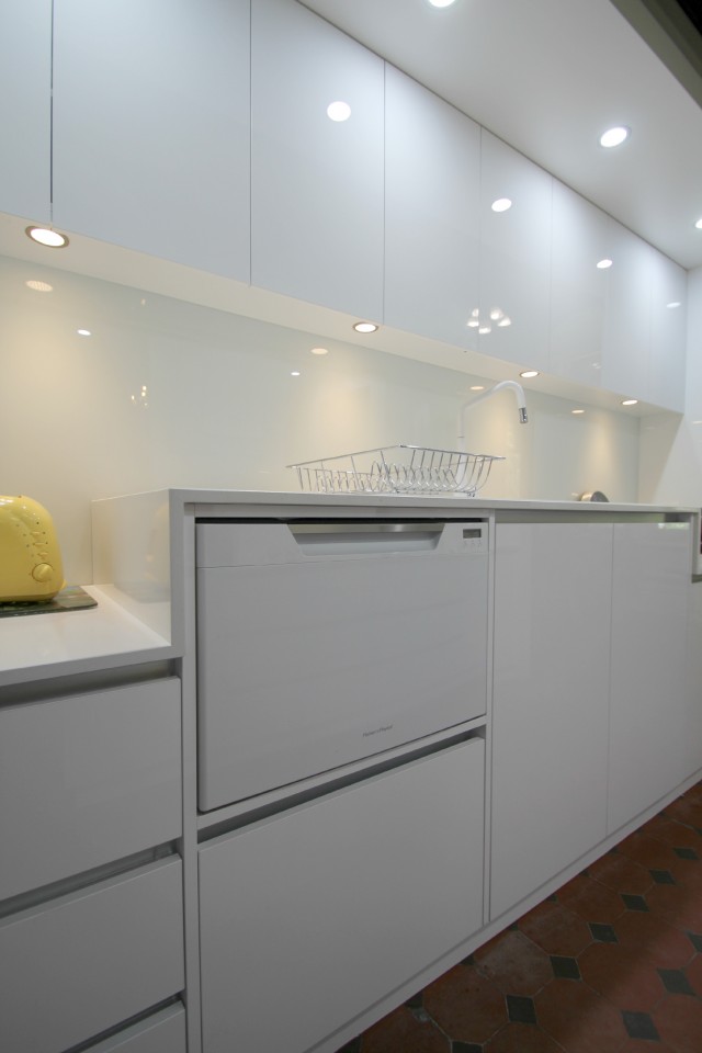 The doors, drawers and panels were manufactured from a white high gloss board.